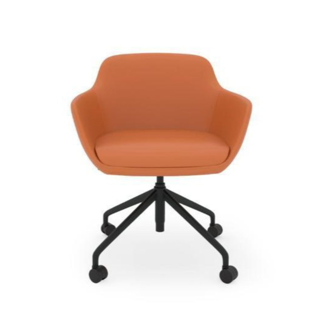Upgrade your workspace with the Avelon Mid-Back Swivel Office Chair, designed with a modern touch and ergonomic comfort. Featuring a sleek orange upholstered seat, supportive armrests, and a sturdy black metal base with smooth-rolling casters, this chair brings both style and functionality to your office or home setup.